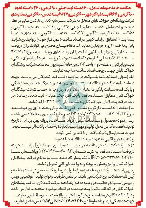 شرح آگهی: مناقصه خرید حبوبات شامل ۸۶۰۰ بسته لوبیا چیتی ۹۰۰ گرمی و ۱۰۲۶۰ بسته نخود ۹۰۰ گرمی و ۱۹۶۶ بسته لپه آذر شهر ۹۰۰ گرمی و ۲۸۲۷ بسته عدس ۹۰۰ گرمی بسته بندی خالص با بسته بندی