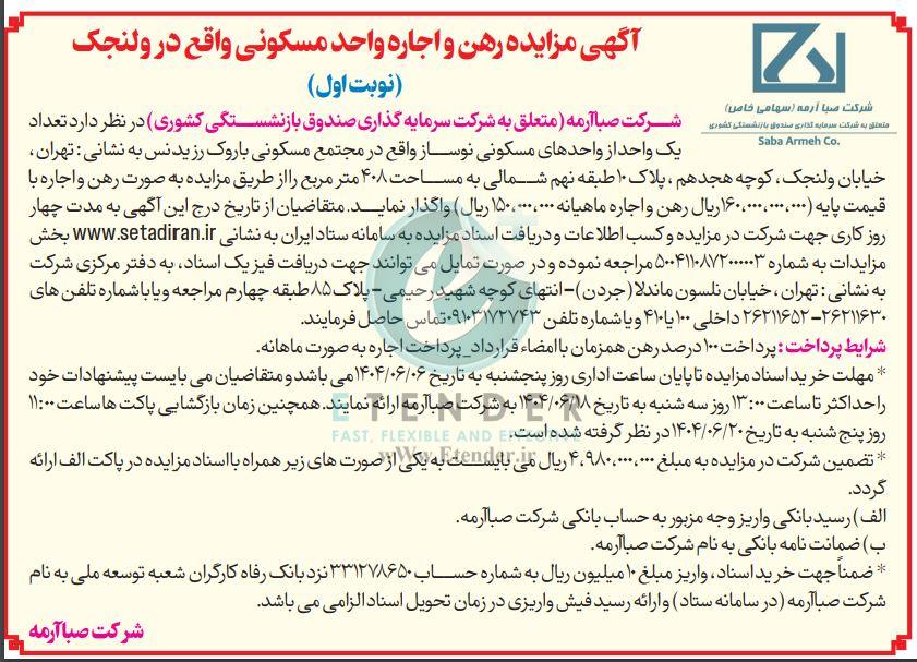 شرح آگهی: مزایده تعداد یک واحد از واحدهای مسکونی نوساز واقع در مجتمع مسکونی باروک رزیدنس به نشانی : تهران خیابان ولنجک کوچه هجدهم ، پلاک ۱۰ طبقه نهم شمالی به مساحت ۴۰۸ متر مربع