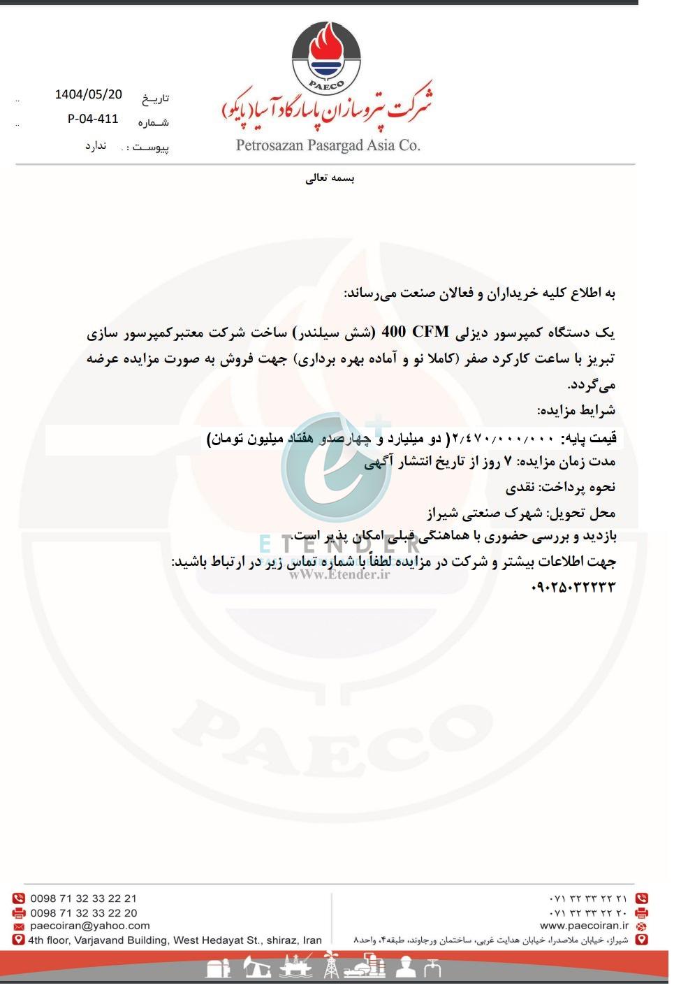 مزایده گذار: خدمات فنی و مهندسی پتروسازان پاسارگاد آسیا