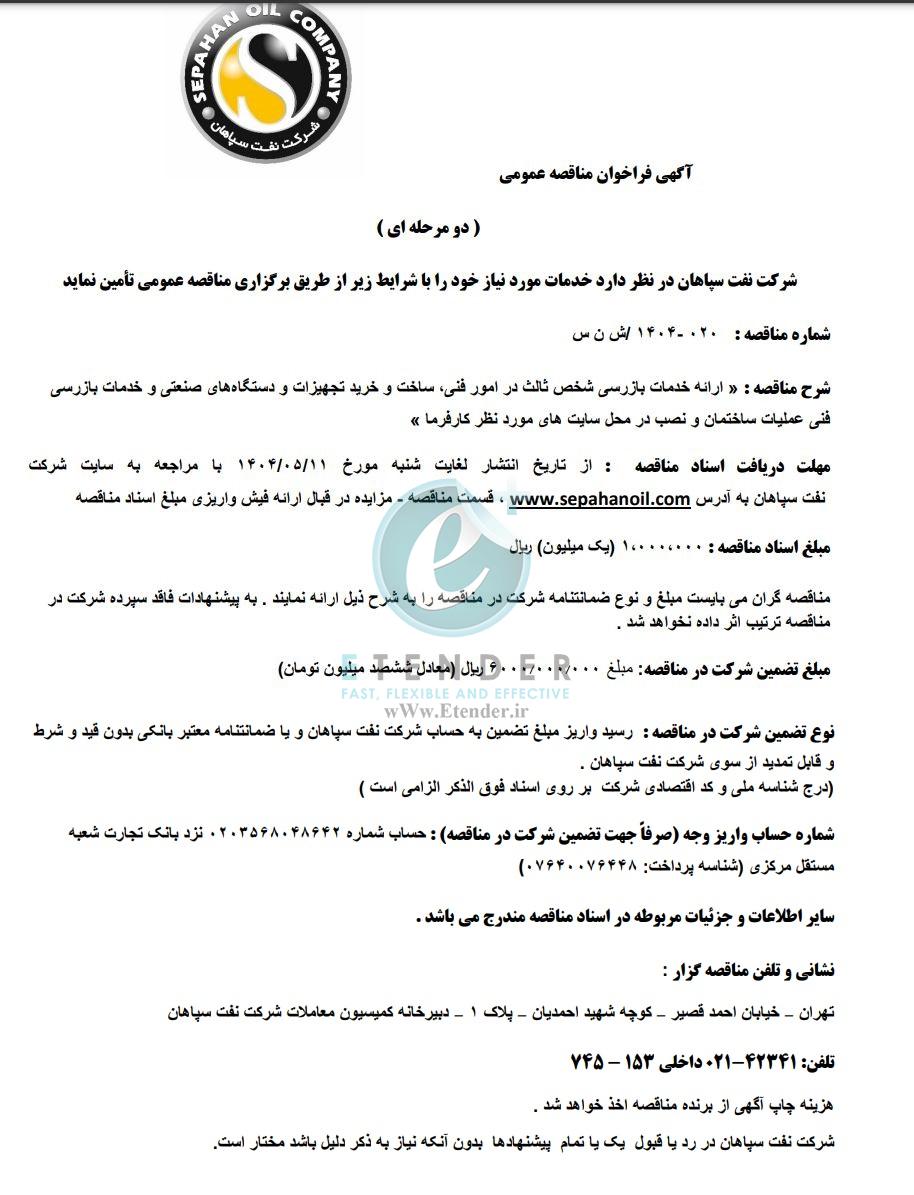شرح آگهی: مناقصه ارائه خدمات بازرسی شخص ثالث در امور فنی، ساخت و خرید تجھیزات و دستگاه ھای صنعتی و خدمات بازرسی فنی عملیات ساختمان و نصب در محل سایت ھای مورد نظر کارفرما