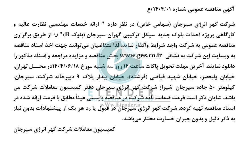 شرح آگهی: شرکت گهر انرژی سیرجان (سهامی خاص) در نظر دارد " ارائه خدمات مهندسی نظارت عالیه و کارگاهی پروژه احداث بلوک جدید سیکل ترکیبی گهران سیرجان (بلوک B)" را از طریق برگزاری مناقصه عمومی به شرکت واجد شرایط واگذار نماید.