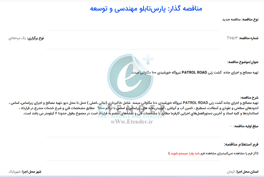 شرح آگهی: مناقصه تهیه مصالح و اجرای جاده گشت زنی PATROL ROAD نیروگاه خورشیدی 100 مگاواتی میمند، شامل خاکبرداری (نباتی ،اصلی ) حمل تا محل دپو ،تهیه مصالح و اجرای زیراساس، اساس ، اندودهای سطحی و نفوذی و آسفالت، تسطیح ، تامین آب و آبپاشی ، کوبیدن لایه های زیراساس و اساس با تراکم 100% در مجموع بطول حدودا 6 کیلومتر می باشد است.