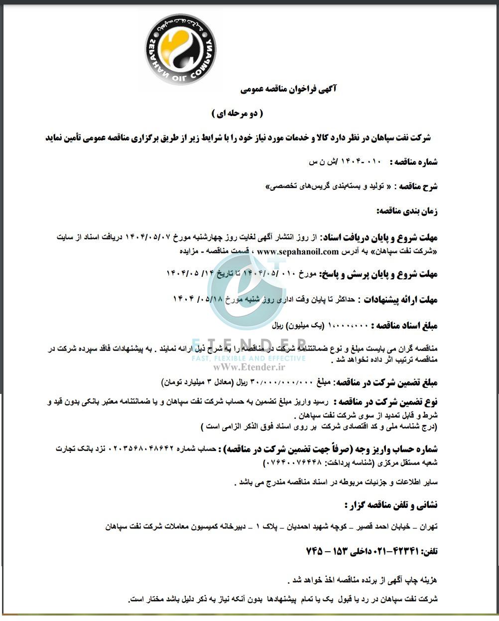شرح آگهی: مناقصه تولید و بسته بندی گریس های تخصصی