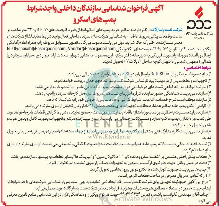 شرح آگهی: مناقصه خرید پمپهای اسکرو انتقال قیر با ظرفیتهای ۷۰ ۱۴۶ و ۳۳۰ متر مکعب بر ساعت و قطعات یدکی مربوطه اقدام به شناسایی شرکتهای سازنده داخلی فعال واجد شرایط نماید.