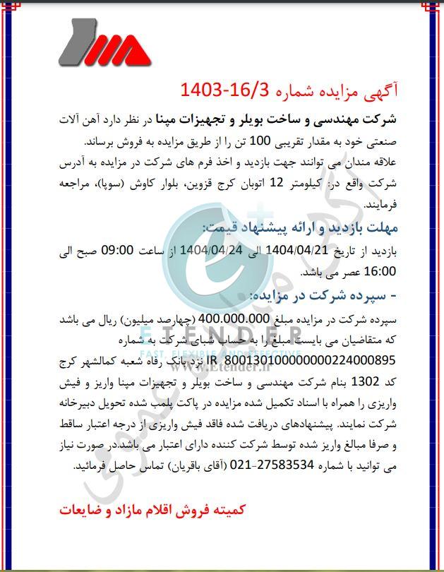 عنوان آگهی: مزایده فروش آهن آلات صنعتی به مقدار تقریبی 100 تن